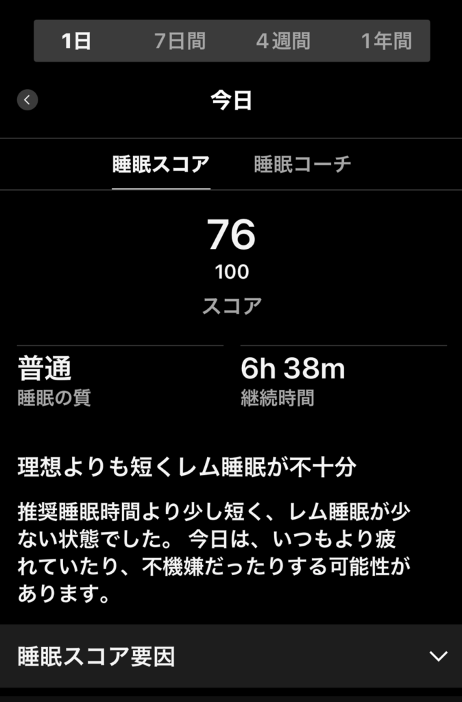 昨日の車中泊時の睡眠スコアです